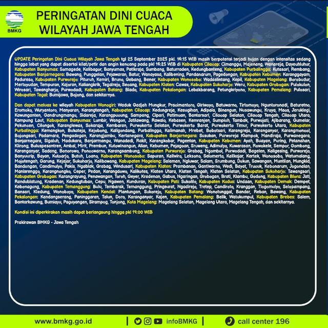 Hujan diprediksi mulai turun sejak siang hari dan akan semakin meningkat pada sore hingga malam. Pola ini merupakan fenomena yang umum terjadi di wilayah Jawa Tengah, terutama saat musim hujan masih berlangsung.
