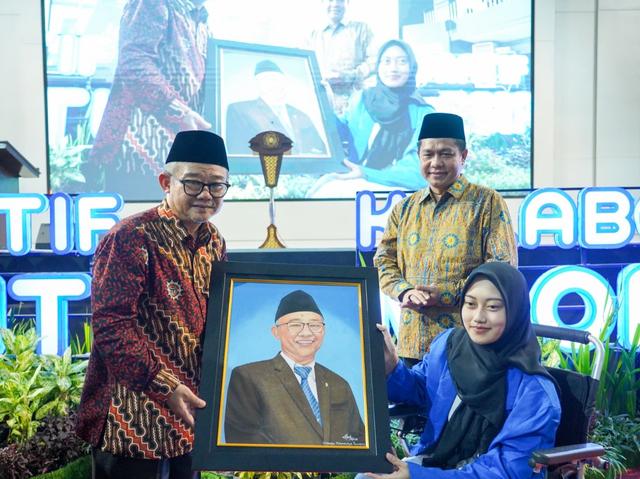 Di hadapan ribuan pasang mata di Aula Ukhuwah Islamiyah, Eprisa hadir dengan kursi roda, namun mencuri perhatian berkat prestasi akademik cumlaude dan bakat seni lukisnya.
