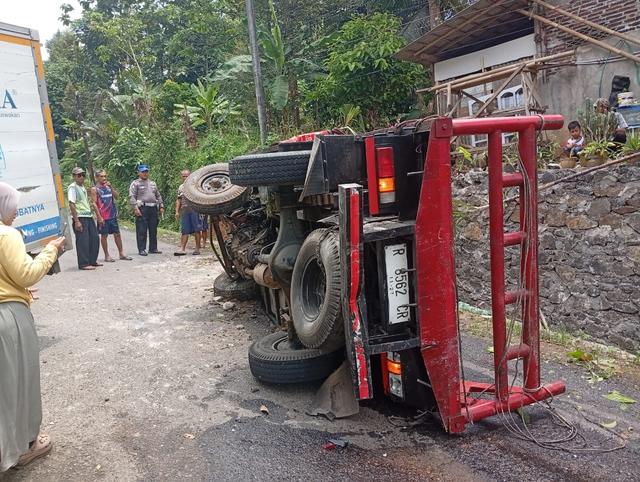 Mobil Daihatsu Sigra, menabrak roda belakang kanan dump truk. Kendaraan besar itu akhirnya terguling dan menghambat jalur lalu lintas.