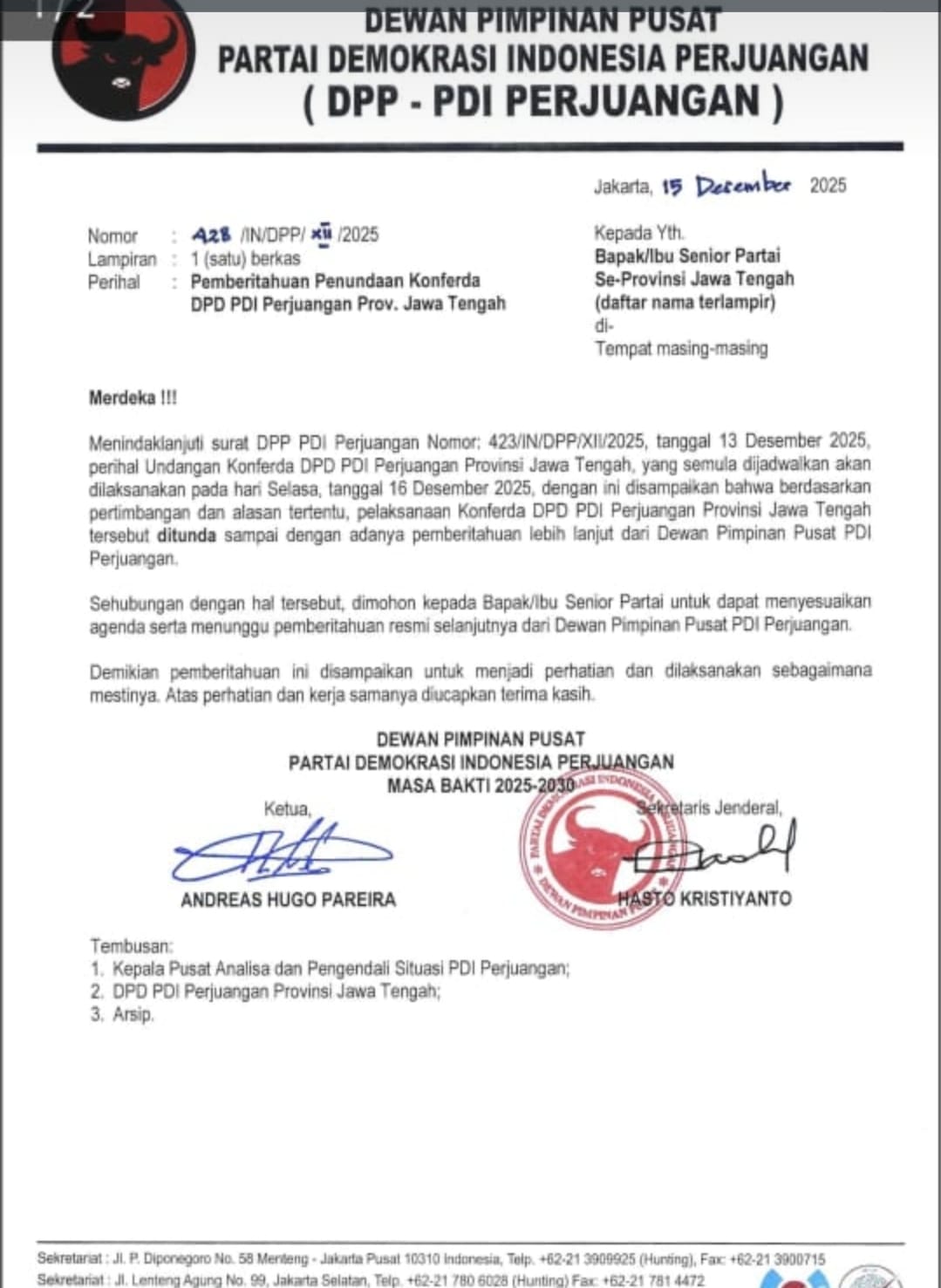 Surat dengan Perihal Pemberitahuan Penundaan Konferda DPD PDI Perjuangan Provinsi Jawa Tengah tertanggal 15 Desember 2025 itu ditandatangani oleh Ketua DPP Andreas Hugo Pareira dan Sekretaris Jenderal Hasto Kristiyanto.